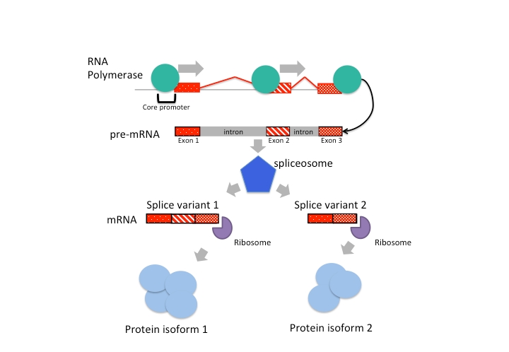 图 1.3:转录后可以通过剪切产生不同的转录本,进而产生不同的蛋白质亚型,因为产生蛋白质所需的信息在转录本中编码。同一基因的不同转录本可以产生不同的蛋白质亚型。