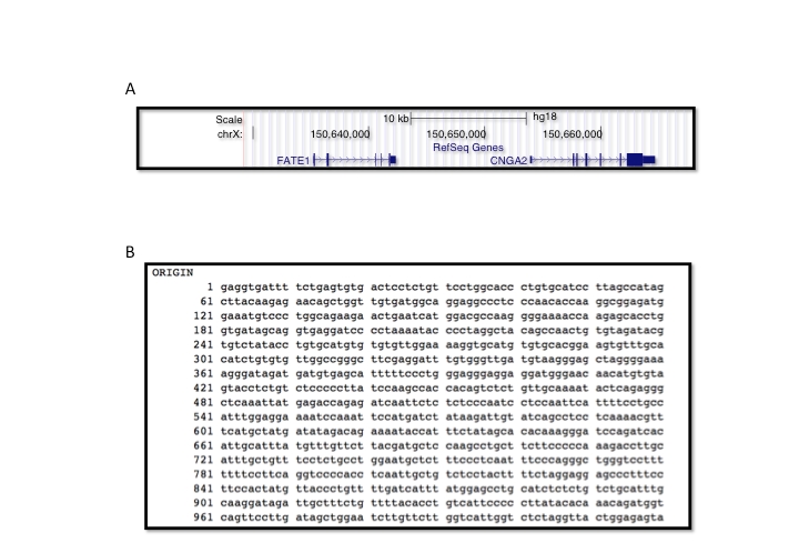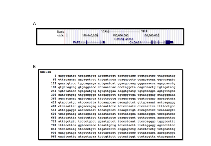 图 1.4: A) UCSC 浏览器中基因的表示方式。方框表示外显子,线表示内含子。B) NCBI GenBank 数据库中显示的 FATE1 基因部分序列。